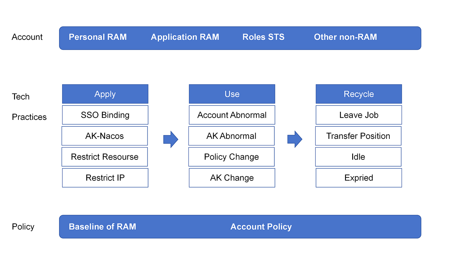 The core of access control is, taking IAM/RAM as the center, and adhering to three security principles—categorized management, least privilege, and special-case attention.