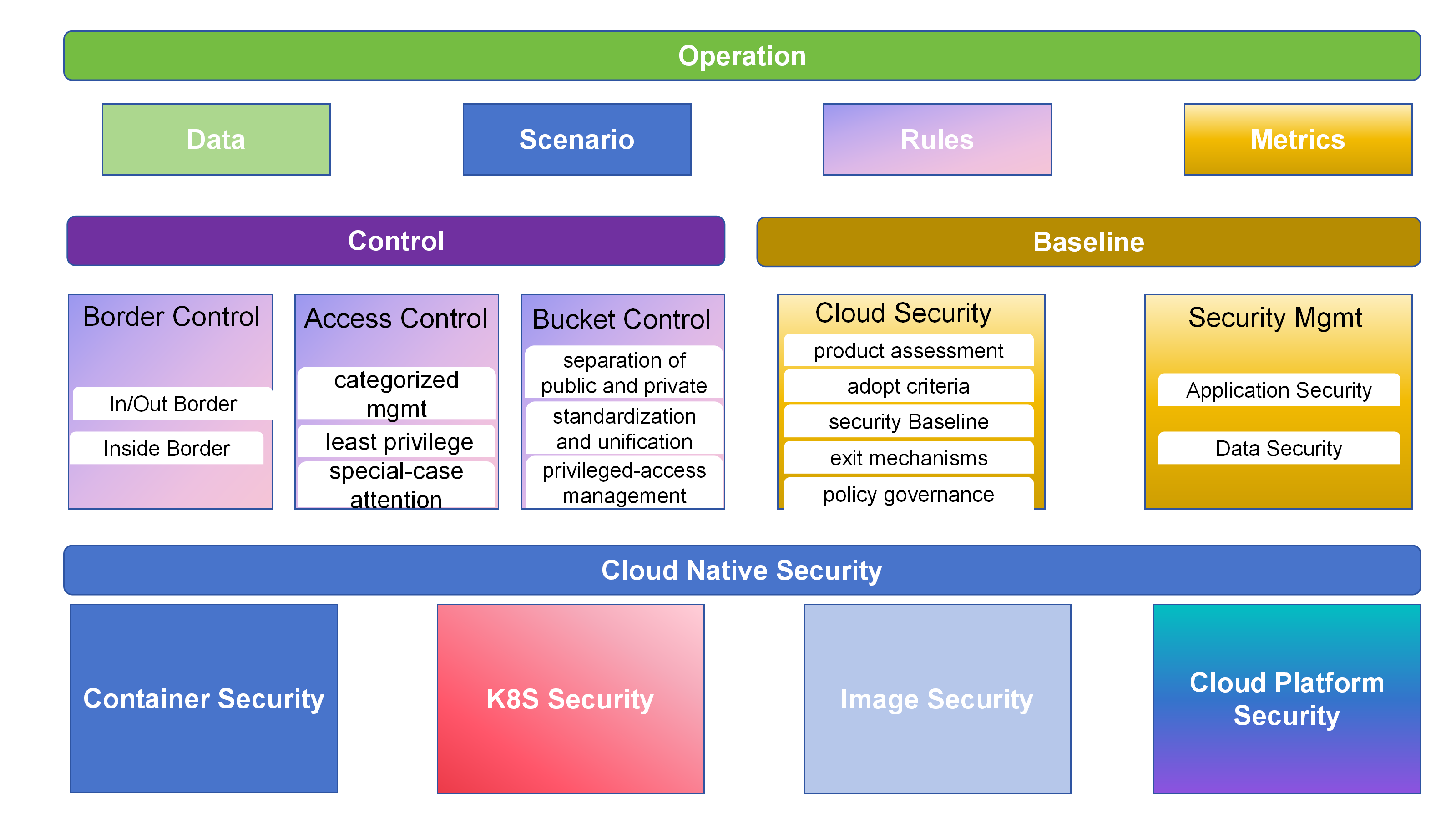 Therefore, the security baseline for cloud products should be managed across five dimensions: cloud product assessment, adopt criteria, security baselines, exit mechanisms, and policy governance.